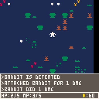 This is probably the most systemically complex game I've ever made. There's a bunch of different magic spells and types of enemies with different statistics and ways of moving. You get experience points to level up and gold to spend at shops.