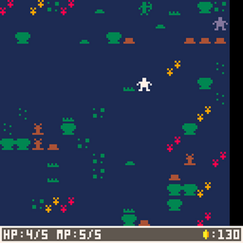 This game was, strangely perhaps, inspired by Justin Smith's Desert Golfing. I was playing the recent sequel Golf on Mars and wondered if I could translate the 'continuous world' sensation to a roguelike sort of game where, instead of travelling through discrete 'levels' of a dungeon, you just gradually end up deeper in the forest. This is the result!